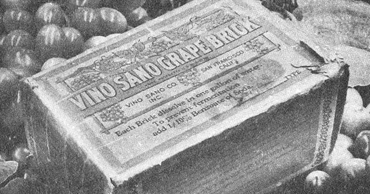 Во время сухого закона в США владельцы виноградников производили твёрдые концентраты виноградного сока, известные как «винные кирпичи». Чтобы избежать проблем с законом, производители обязаны были гарантировать, что продукт не используется для изготовления вина, поэтому концентрат продавался с предупреждением о том, что после растворения в воде его ни в коем случае нельзя хранить в тёмном прохладном месте в течение 20 дней.