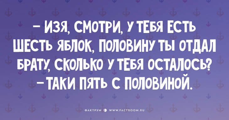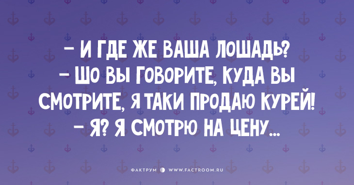 Анекдоты 19.08.2016 15 одесских шуток, которые поднимут настроение Читайте также: Подборка шуток и анекдотов №7 Еще: 30 открыток от мастеров тонкой иронии 15 анекдотов из роскошной Одессы 20 открыток с шутками 20 коротких приколов 20 одесских анекдотов, шобы вы уже перестали иметь это томное выражение лица и посмеялись Интересные факты из рубрики «Анекдоты»