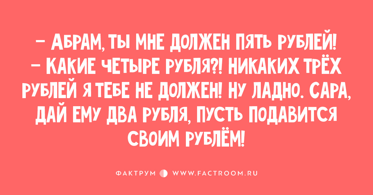 — Ребе, я сегодня был в городе, встретился с одной женщиной, и у нас с ней все было хорошо. Я дал ей пять рублей. Она сказала: «Спасибо, приходите еще!». Так я вас хочу спросить, как вы думаете, могу я за эти пять рублей прийти к ней еще раз?