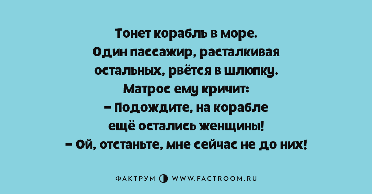 Тонет корабль в море. Один пассажир, расталкивая остальных, рвётся в шлюпку. Матрос ему кричит: