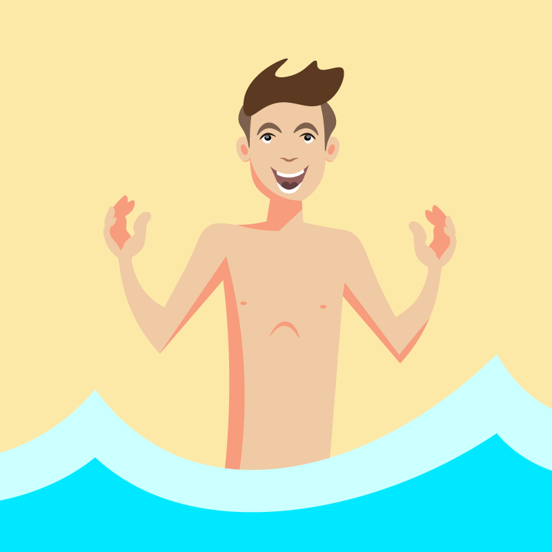 Первый раз в жизни приехав на море, мужчина разузнал про один дикий пляж и отправился туда. Попав туда и поразившись, что на пляже совсем никого нет, он быстро скинул с себя всю одежду, сложил вещички рядом с каким-то камнем и кинулся в воду.