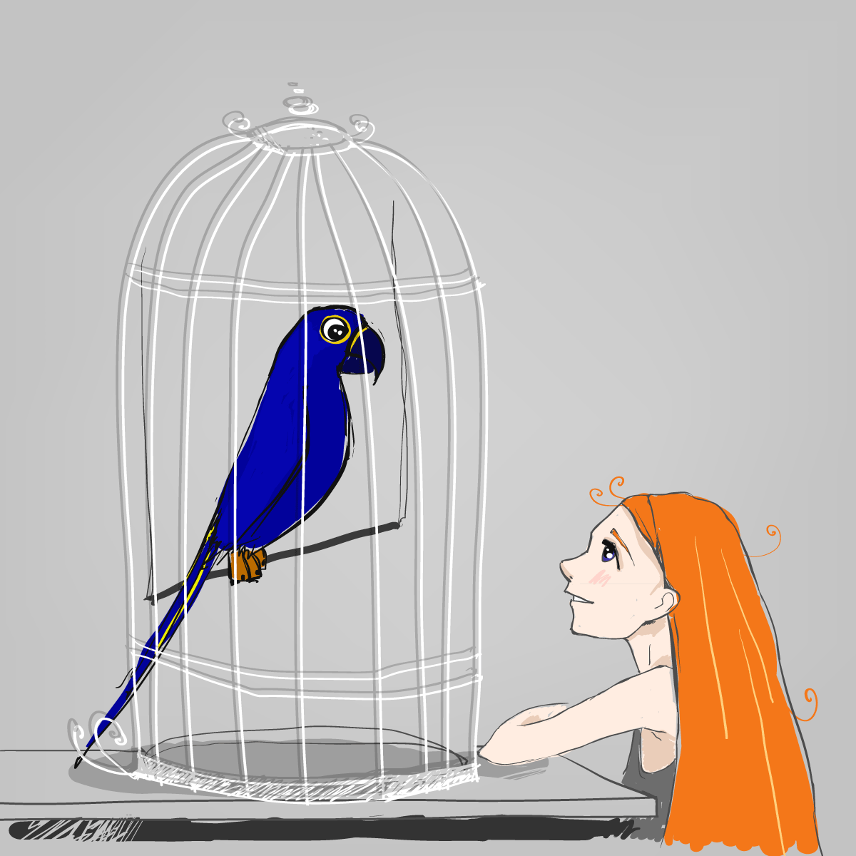 Пришла женщина на птичий рынок, чтобы купить себе говорящего попугая. Ходила, ходила — ничего не нашла, уже собралась уходить, как увидела огромную клетку с птицей. Она подошла, просунула палец между прутьями и восхищённо сказала: