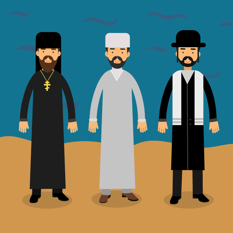 Как-то раз решили поп, мулла и раввин искупаться летним днём в реке. Пришли на пустынный пляж, разделись и в чём мать родила пошли в воду. Пока они плавали, на пляже постепенно собирались отдыхающие, и перед священнослужителями возник вопрос, как выходить на берег.