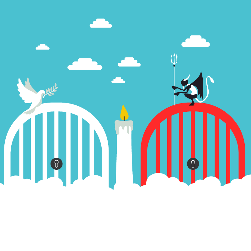 — Так, сейчас по спискам проверю, кто куда попадёт — в рай или ад.