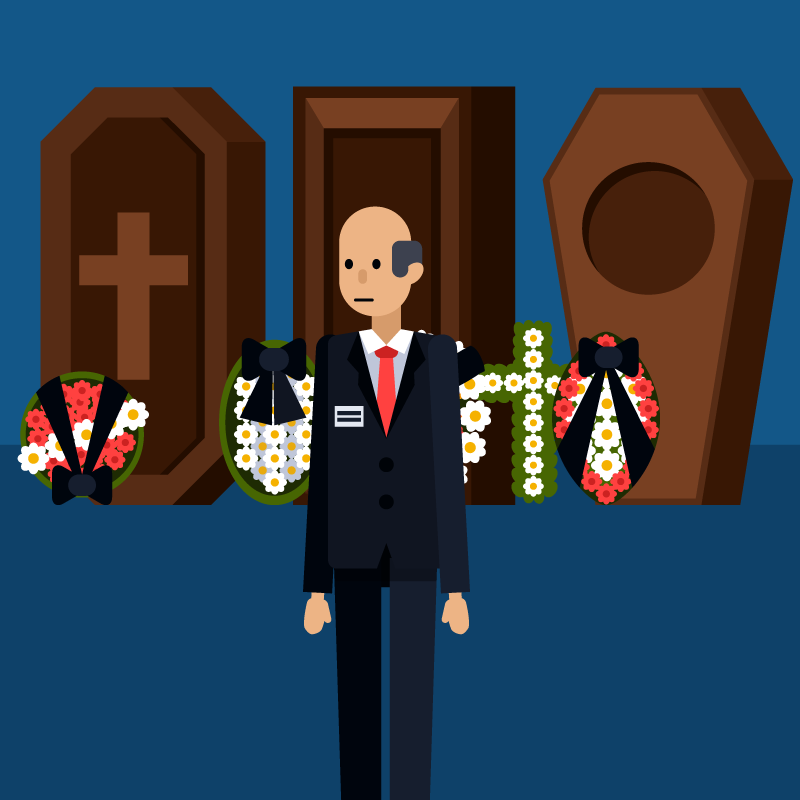 Как-то вечером в двери похоронного бюро входит мужчина в чёрном костюме. Он осматривается вокруг, пролистывает несколько каталогов и, видимо, не найдя нужного, обращается к продавцу: