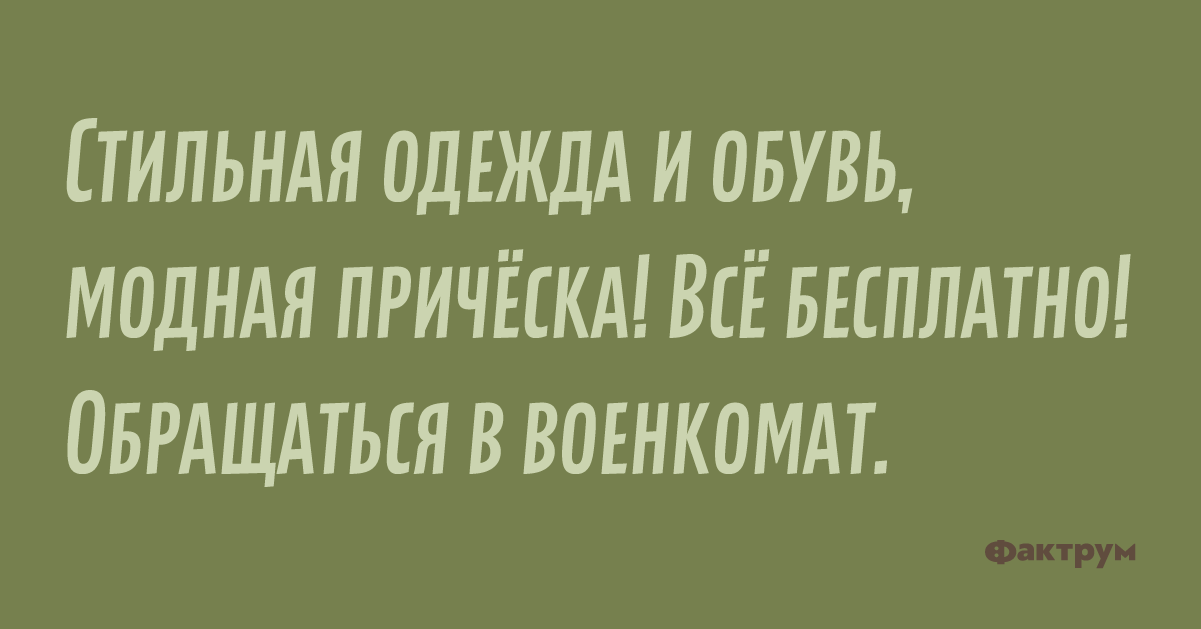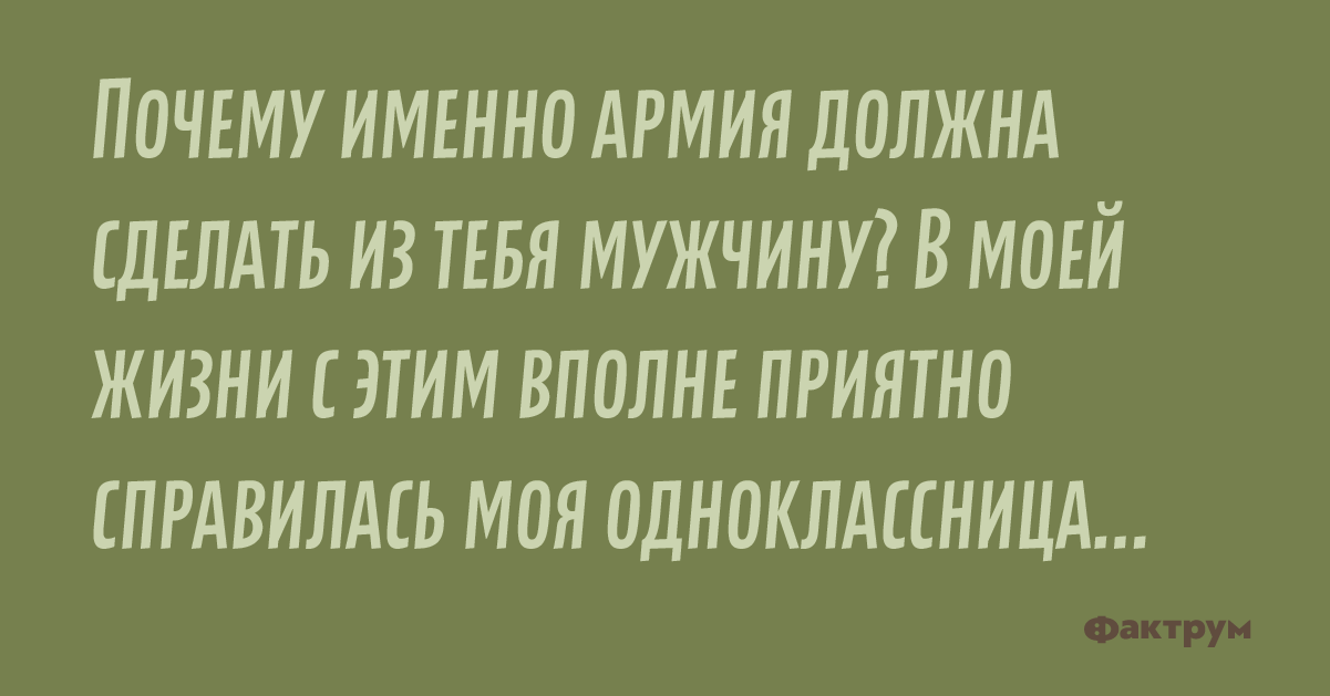 — Прикинь, моя сестра чеканулась. Она переоделась мужчиной и пошла служить в армию.