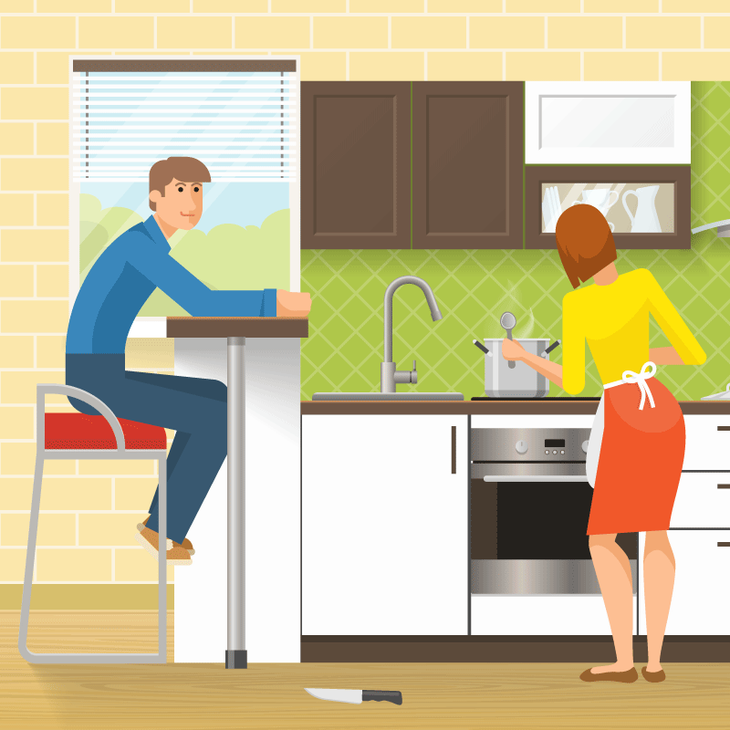 Субботним вечером муж с женой на кухне готовят ужин. Вдруг муж, режущий морковку, отвлёкшись на сюжет в телевизоре, роняет ножик на пол.