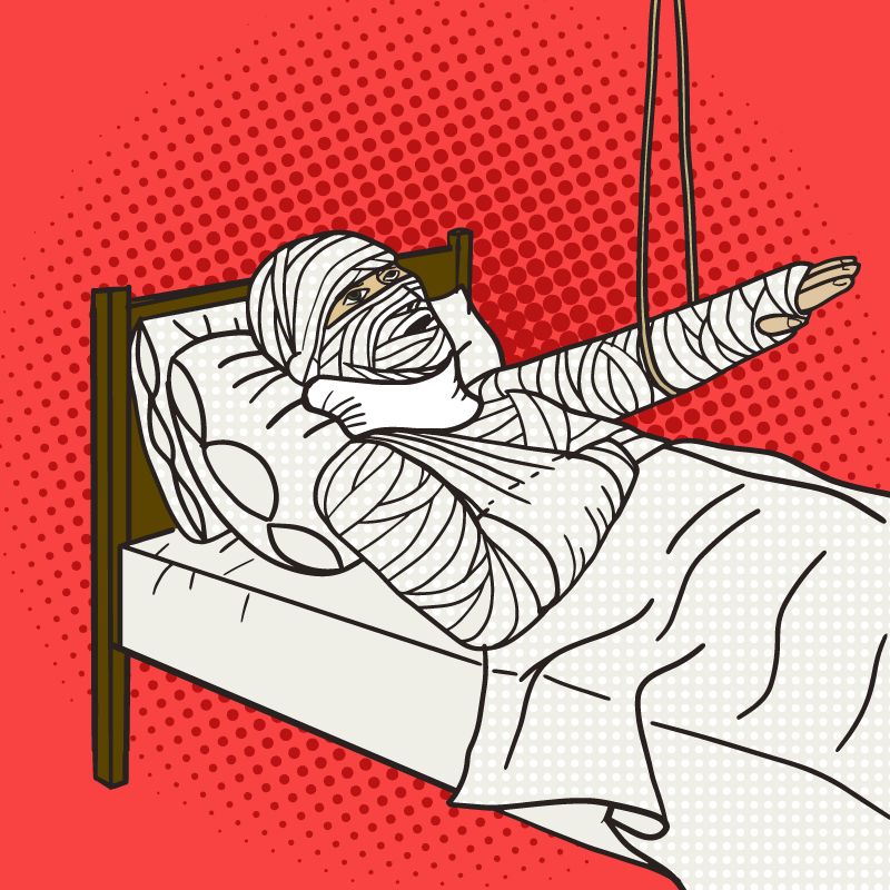 Главврач делает обход вместе с другими докторами. Они заходят в палату травматологии, где стоят 20 коек с загипсованными с головы до пят мужчинами. Главврач говорит своим коллегам: