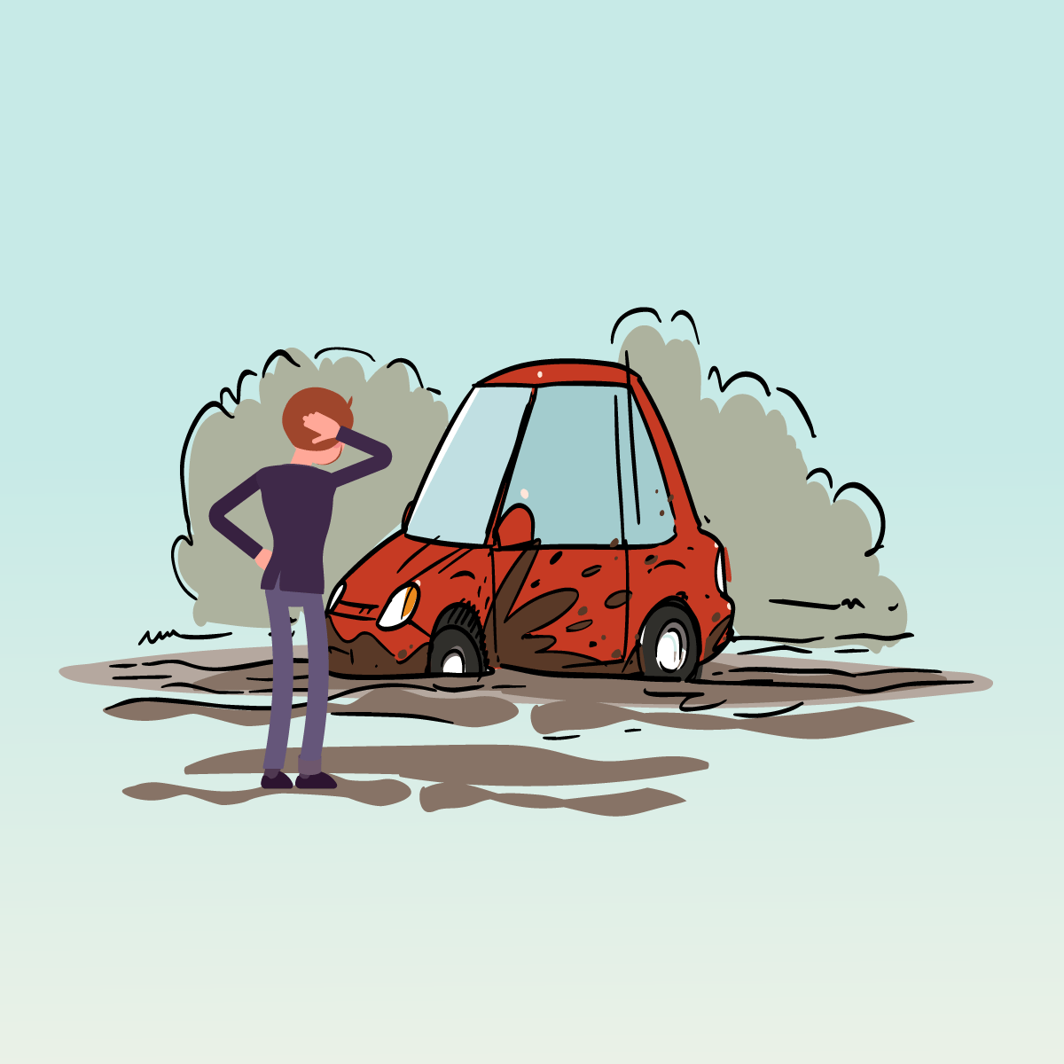 Поехал мужчина в деревню и на въезде застрял в большой луже. Он попытался вытащить свою машину самостоятельно, но не смог.