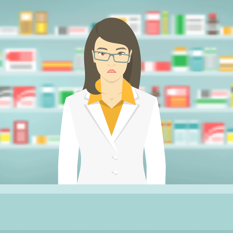 Длинная очередь в аптеке, молодая девушка-провизор, наклонившись, что-то ищет внизу витрины. Вдруг в аптеку врывается женщина и, расталкивая всех, прорывается к окошку около кассы. Она просовывает в него руку, хватает девушку-провизора за ворот халата и разъярённо кричит: