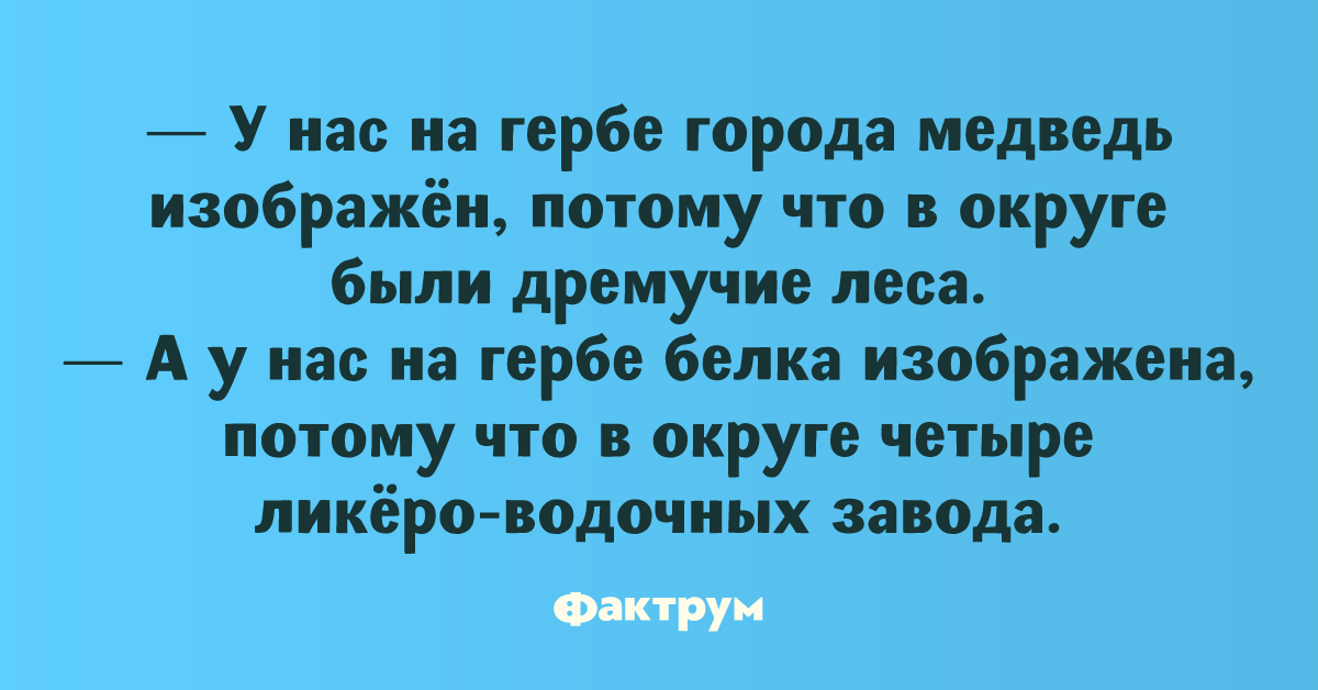 — А у нас на гербе белка изображена, потому что в округе четыре ликёро-водочных завода.