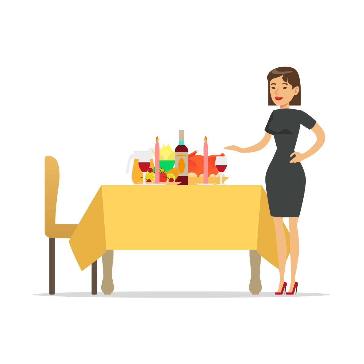 Приходит муж с работы и видит жену в красивом чёрном платье, стоящую возле накрытого стола с шикарными блюдами. Сняв пальто, муж заключает супругу в объятия, целует её и с искренней улыбкой говорит: