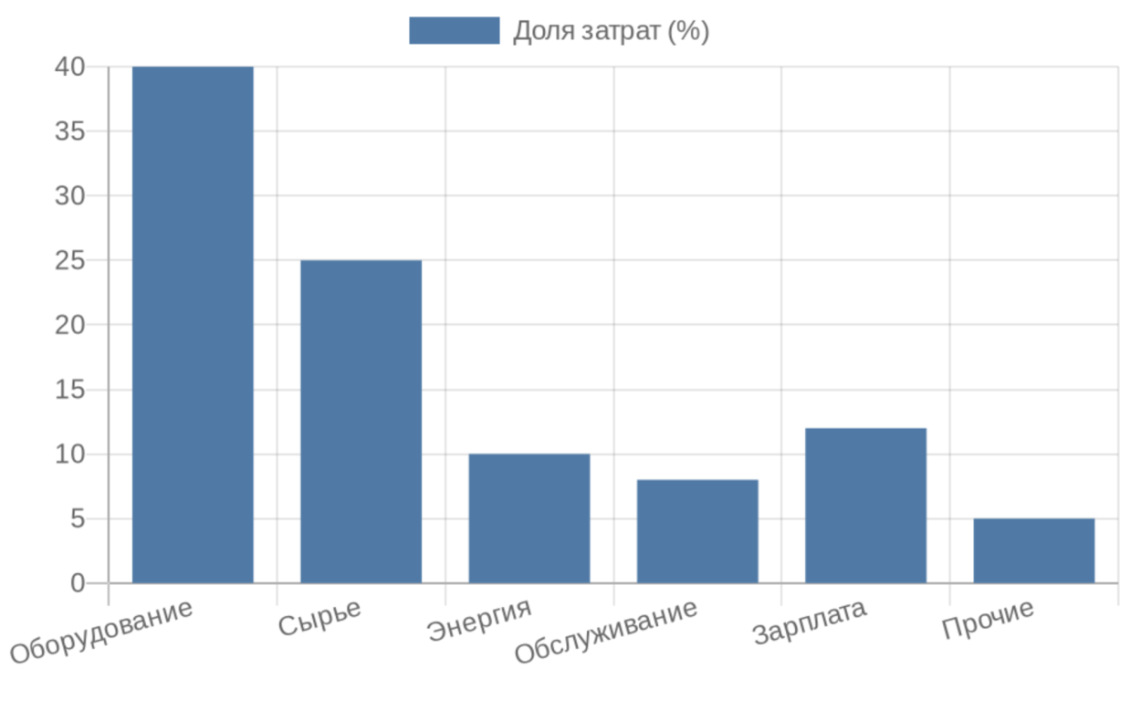 Для визуализации распределения затрат в мебельном производстве полезна диаграмма, показывающая пропорции вложений.