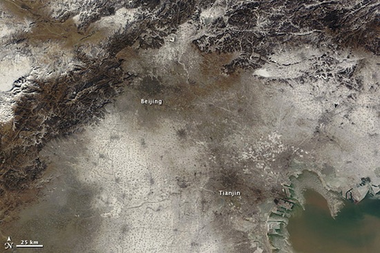 На фото — снимок NASA, который демонстрирует масштабы загрязнения. На изображении отчётливо видно обширную дымку, низкие облака и туман над регионом. Серые и жёлтые оттенки на фоне яркого облака наглядно свидетельствуют о катастрофическом экологическом положении Китая. В безоблачных районах можно увидеть над городом скопления серого и бурого смога.