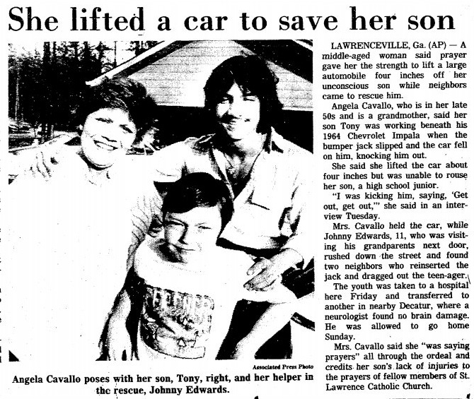 Вы, возможно, слышали «городские легенды» про «женщину, поднявшую машину после аварии», но, верите вы в это или нет — это не просто легенда. Она рассказывает об Анджеле Кавалло, чей сын чинил «Шевроле-импалу» 64-го года, когда машина соскользнула с домкрата, и он оказался в ловушке под колёсами.