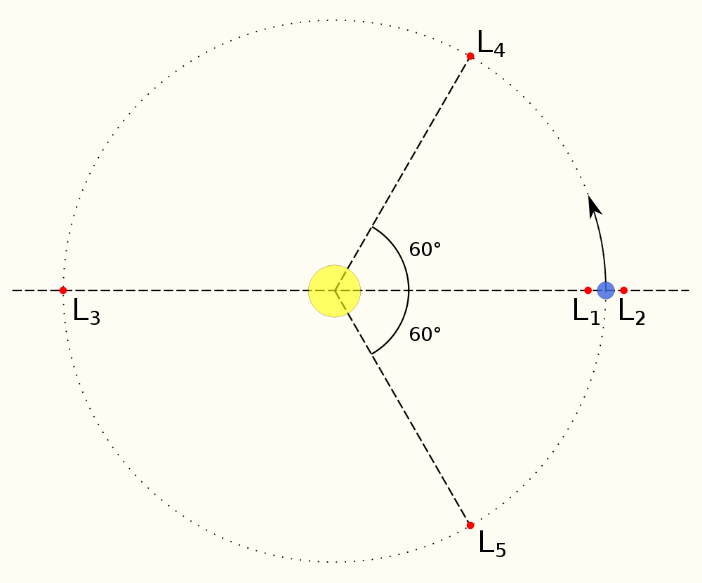 Первые три точки Лагранжа (обозначенные как L1, L2 и L3) располагаются в одну линию с двумя большими телами и находятся в метастабильном состоянии. L4 и L5 располагаются под углом 60° спереди и сзади от второго тела на его орбите и находятся в стабильном состоянии».