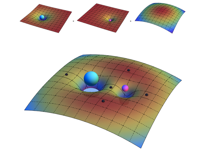 Изображение показывает зоны, связанные с первой массой, второй массой и вращающейся системой координат. Если соединить их вместе, эти зоны образуют действующее поле. Пять точек Лагранжа обозначены серыми сферами.