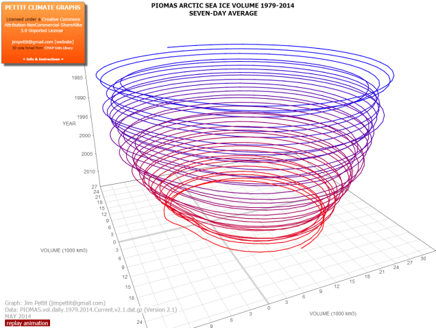 До этого момента «National Geographic» использовал карту Арктики из его атласа редакции 1989-го года. Однако, с того времени не только площадь, но и объём морского льда в Арктике (как показано на графике объёма морского льда в Арктике с 1979-го года по настоящее время, представленном ниже) резко сократился. В новейшем издании, которое выйдет в сентябре, линии будут очерчивать гораздо меньшую площадь, основываясь на данных НАСА и Национального центра обработки данных снега и льда (NSIDC) о количестве оставшихся многолетних льдов.