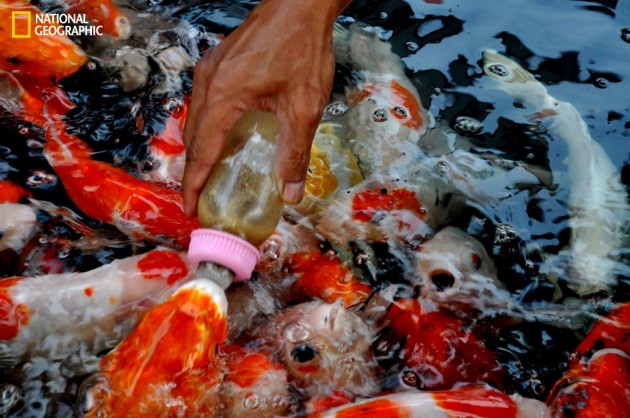 «Увидеть в Азии, как люди кормят золотых рыбок, также, как мы в Европе кормим голубей — это обычное дело. Идея заключается в том, чтобы создавать гармоничные формы, бросая корм в определенные места водоема. Либо это делается просто для того, чтобы весело провести время. Кормление рыб из бутылочки тоже является популярным аттракционом».