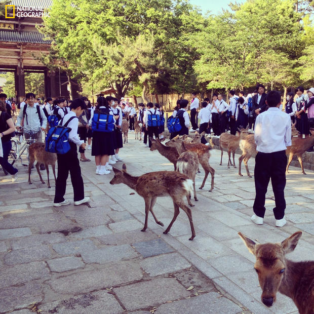 «В окрестностях Киото вы можете найти деревню, которая называется Нара. Там все парки и храмы заполнены дикими и свободными оленями. Вы можете погладить их, или покормить. Люди здесь с удивительным уважением относятся к животным и растениям. На этом фото вы видите группу школьников во время посещения одного из главных храмов. Они относятся к оленям так, как будто те — их одноклассники».