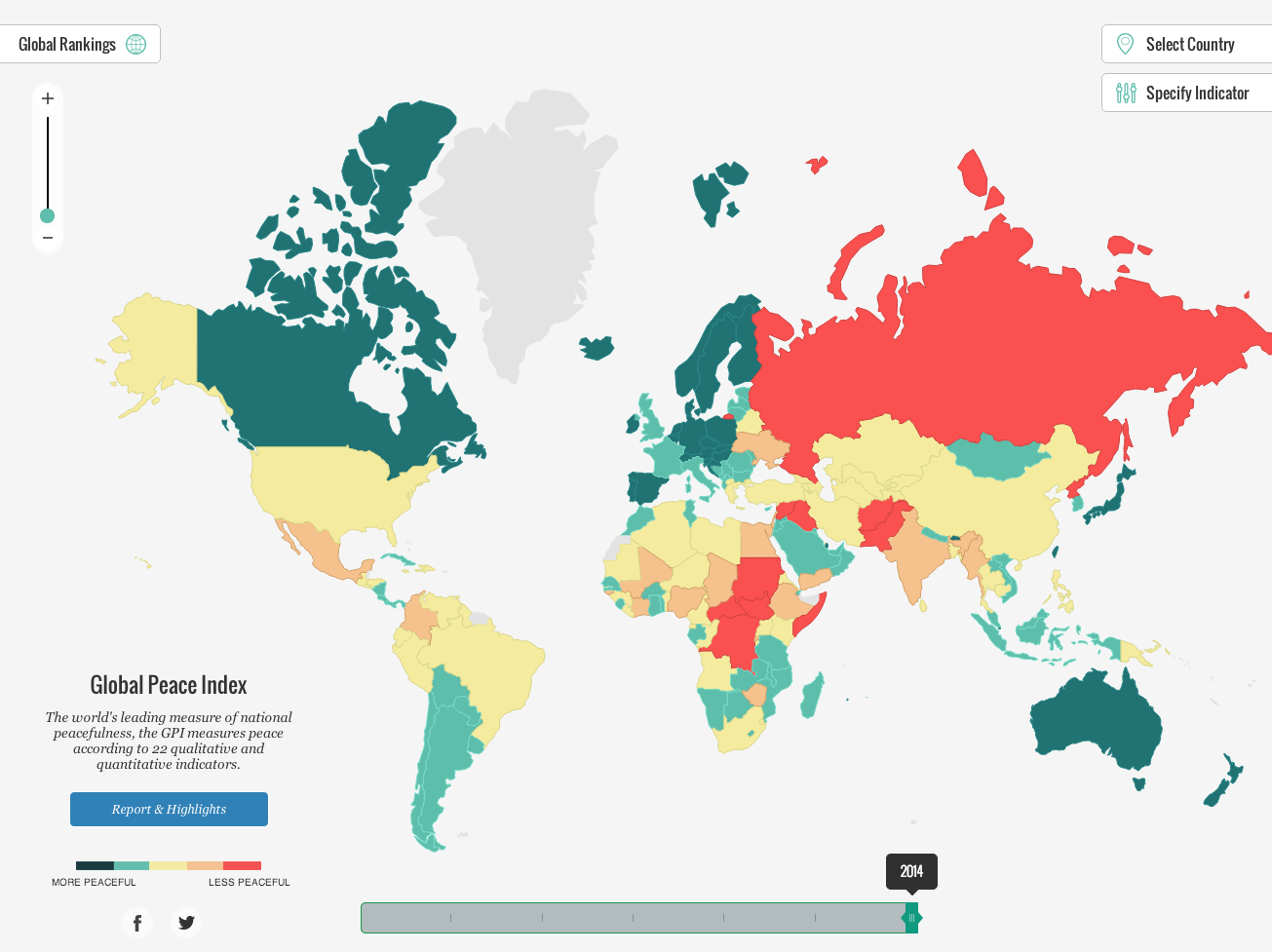Годовой отчёт под названием «Индекс глобального мира» называет главными виновниками нападения боевиков и растущую криминализацию, особенно в Ираке, Сирии, Афганистане, Судане и Центральноафриканской республике. На Ближнем Востоке, в Южной Африке и Азии возросло количество людей, убитых во время атак боевиков. Количество убийств стремительно увеличивается в растущих городских центрах, и большее количество беженцев вынуждено бежать из зоны военных действий.