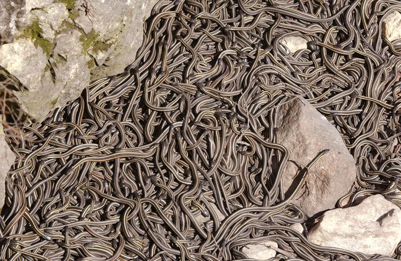 Каждую весну канадские прерии Манитобы становятся морем кошмарных извивающихся змей. Тысячи сбившихся в кучу безобидных полосатых ужей с красными полосами по бокам собираются вместе, и это считается крупнейшим сбором змей в мире. После долгой зимней спячки они выползают на свежий воздух, чтобы порезвиться на солнце и провести свои ритуалы спаривания.