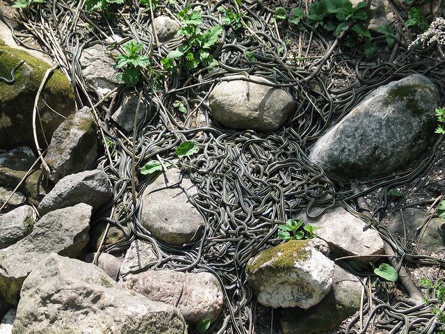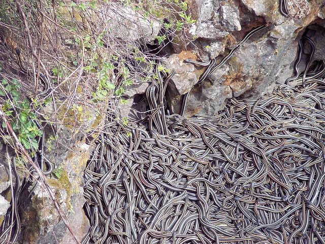 Хладнокровные змеи любят эти ямы, которые идеально подходят для спячки во время суровой канадской зимы, когда температура может падать до 50-ти градусов ниже нуля. Поэтому они мигрируют отовсюду и селятся в этих воронках. Из-за ограниченного количества провалов змеи с этой территории должны ползти в ближайшее логово. Поэтому буквально десятки тысяч змей набиваются в одну воронку размером со среднюю гостиную.