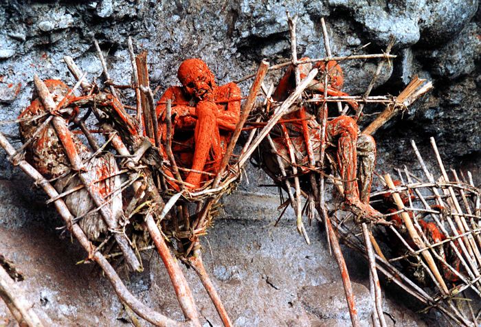 На протяжении веков племя Анга из Папуа — Новой Гвинеи в нагорье Маробы практиковало уникальную технику мумификации — копчение. После копчения мумии не хоронят в гробницах или могилах, а устанавливают на крутых скалах, откда открывается вид на находящуюся внизу деревню. Сам вид цепи обугленных красных тел, висящих на скалах, может показаться довольно гротескным, но для людей Анга это высшая форма уважения к мёртвым.