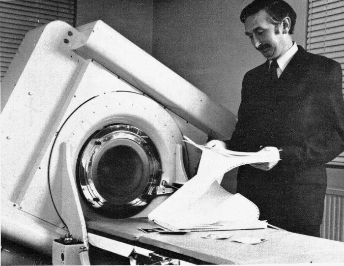 А в 1967-м году учёный из EMI по имени Годфри Хаунсфилд изобрёл осевой томограф. EMI также является звукозаписывающей компанией, которая продала 200 млн записей группы «The Beatles», так что она использовала свои средства для того, чтобы финансировать Хаунсфилда в течение четырёх лет. Именно столько ему потребовалось для того, чтобы создать прототип аппарата. В его сканере вместо плёнки использовались датчики, а пациент просто проезжал между трубок и сенсоров с заданной скоростью. После чего компьютер реконструировал анатомическое строение пациента. Сегодня это называется просто: компьютерная томография. 1 октября 1971-го года Хаунсфилд впервые использовал собственное изобретение для обнаружения опухоли в мозгу женщины.