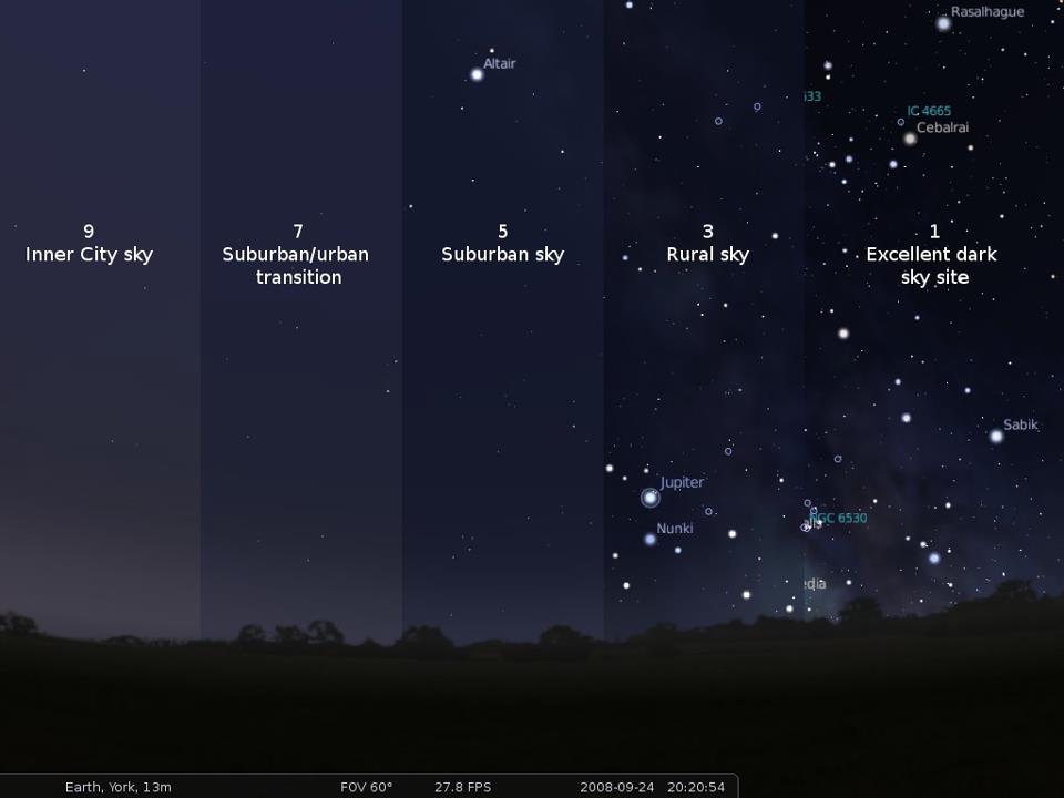 Кажется, что темнота — это довольно просто: Солнце заходит, и небо темнеет. Иногда на нём появляются звёзды, иногда нет. Но с темнотой всё гораздо сложнее. На самом деле существует особая шкала, разработанная специально для того, чтобы измерять разные степени темноты. Шкала Бортле для оценки степени темноты неба была создана в 2001-м году, и измеряет темноту неба в пределах от 1 до 9. Отметка 1 на шкале — это действительно тёмное небо. Дальше начинается масса технических деталей (таких, как звёзды и созвездия, которые можно видеть невооружённым глазом), но 1 — это когда вы не можете разглядеть свой автомобиль на парковке, даже если он стоит прямо перед вами. 2 — это когда вы начинаете видеть слабый свет на горизонте, и даже если при этом виден Млечный Путь, разглядеть его непросто. 3 — это небо, которое можно наблюдать в любой деревне, а 4 — это небо, которое можно наблюдать на границе сельской местности и пригорода. 5 — это небо в пригороде. 6 — это тоже «пригородное небо», но более яркое. 7 — такое небо можно наблюдать на границе города и пригородных районов. 8 — это ночное городское небо. 9 — небо в ярко освещённом городе. Когда вы доберётесь до отметки 9, вы вряд ли сможете увидеть ночью какие-нибудь звёзды или созвездия, даже с помощью телескопа. Разглядеть вы сможете только крупные небесные тела, такие, как Луна.