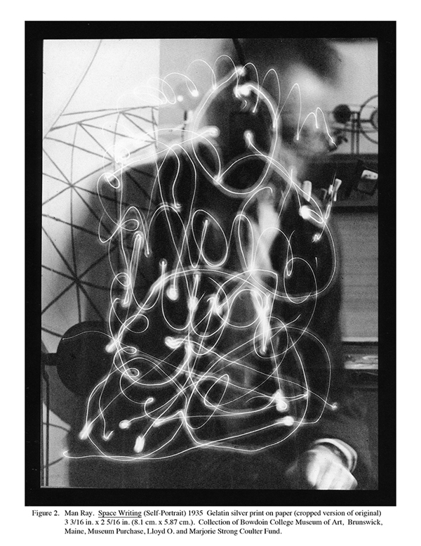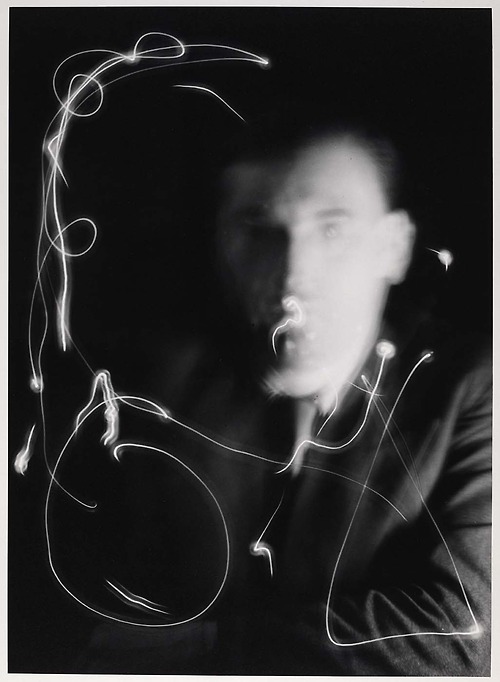 А в искусстве этот метод начал использоваться в 1935-м году, когда художник-сюрреалист Ман Рэй использовал фотокамеру с отрытым затвором для того, чтобы снять самого себя, стоящего в потоках света. Очень долго никто не догадывался о том, что это за световые завитки изображены на фото. И только в 2009-м году стало ясно, что это не набор случайных световых завитков, а зеркальное отображение подписи художника.