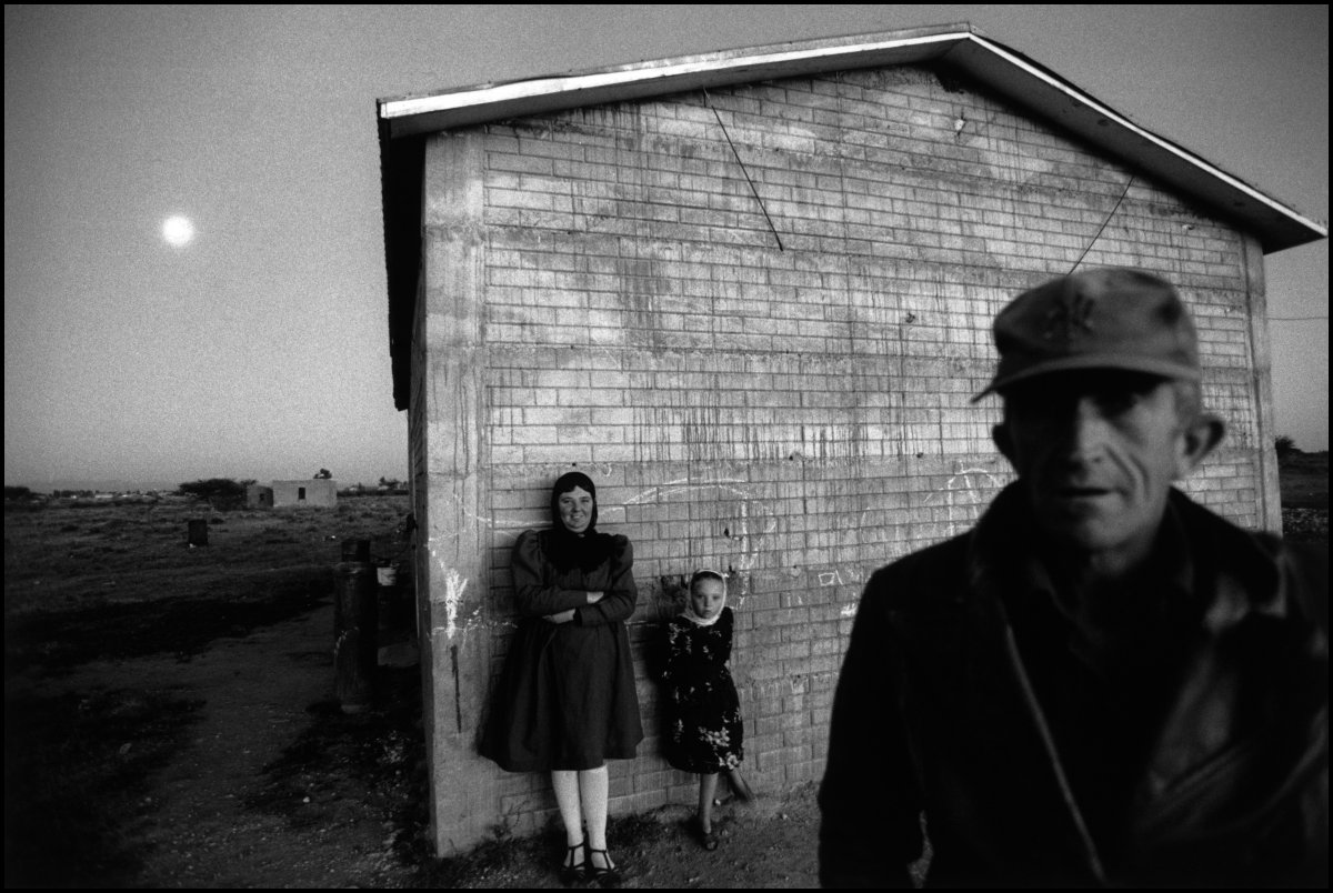 «Я обнаружил это фото, когда просматривал свою работу по мексиканским меннонитам. Это было порядка двух тысяч рулонов плёнки, отснятой за десять лет. Только 120 фотографий оттуда попали в книгу. Колония под названием La Honda была одной из немногих, в которых было электричество. Я навещал там Фрэнка Классена и его жену. Они были безработные, безземельные и нищие, и планировали податься в Канаду, чтобы найти работу на какой-нибудь ферме. Мы курили с ними за столом, при свете керосиновой лампы. А когда мы вышли на улицу, я сфотографировал их в тот момент, когда взошла луна».