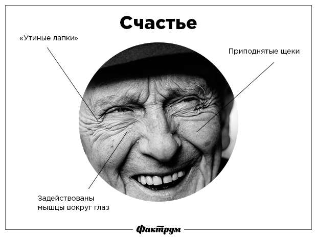 В выражении радости задействована как верхняя, так и нижняя часть лица. Помимо подъёма и растягивания в стороны уголков рта (то есть улыбки), выражение радости включает в себя сокращение мышц вокруг глаз, в результате чего возникают «гусиные лапки», и движение лицевых мышц под глазами, в результате чего могут возникать складки. Челюсти широко открыты, зубы разомкнуты, никакого напряжения нет. Истинная улыбка — всегда анатомически чёткая, и указывает на подлинное чувство счастья.
