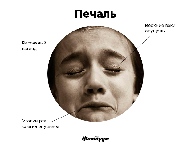 Выражение печали трудно симулировать, потому что здесь брови слегка поднимаются вверх, а уголки губ опускаются вниз, что ассоциируется с грустью. Лишь очень немногие люди могут по желанию слегка поднять брови, но этот едва заметный подъём виден у каждого, кто испытывает подлинную печаль. Когда кому-то грустно, также наблюдается небольшое опускание верхних век, отсутствующий взгляд и небольшое смещение вниз уголков губ и нижней челюсти.