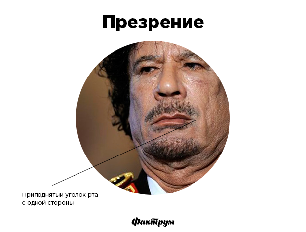 Выражение презрения уникально тем, что оно требует асимметрии. Большинство эмоциональных выражений могут быть двухсторонними, но презрение — единственная эмоция, которая выражается только одной стороной лица, в виде приподнятого и оттянутого уголка губ.