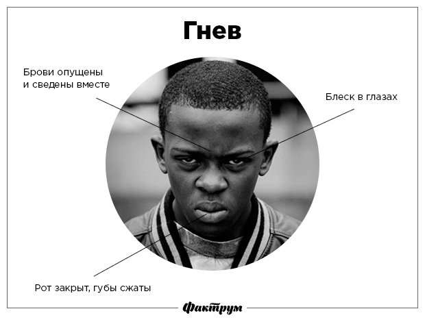 Гнев может варьироваться от лёгкого раздражения до неприкрытой злости. И хотя есть различные степени интенсивности гнева, все они сопровождаются одним и тем же выражением лица. При гневе мы часто видим опущенные брови и блестящие глаза. Губы плотно сжаты, верхние веки оттянуты назад, нижние веки подтянуты вверх.