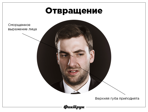 Это мощное выражение порождается чувством отвращения к какому-то объекту или человеку, или даже мыслью о чём-то отталкивающем. Нос обычно сморщивается, а верхняя губа — поднимается.