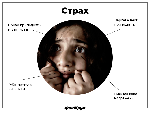 Выражение страха было создано, чтобы служить предупреждающим сигналом в опасных ситуациях. Когда мы испытываем страх, наши брови поднимаются и стягиваются, нижние веки напрягаются, а губы немного растягиваются по горизонтали.