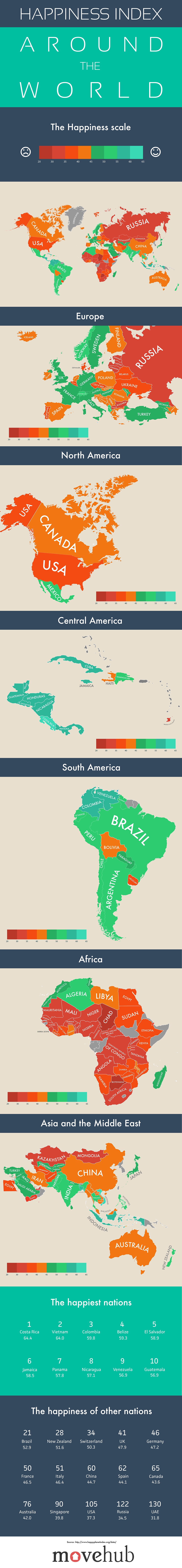 Получилось… красно-оранжевно. Очевидно, что счастливых стран невероятно мало по сравнению с теми, кому живётся невесело. Не слишком счастливы неблагополучные африканские регионы, и всё ниже падает уровень счастья жителей США, особенно на фоне соседней бедной и весёлой Мексики. Россия вместе с Европой пребывает, скорее, в унынии, чем в депрессии, а самые счастливые страны на планете — Коста-Рика, Вьетнам и Колумбия.