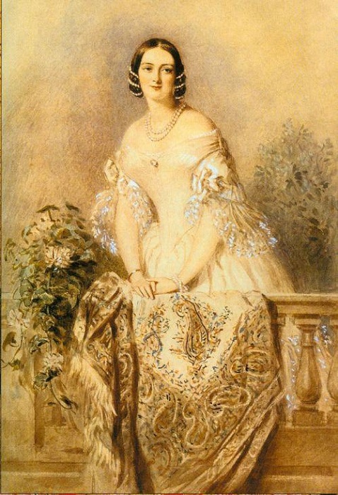 2. Этот предмет женского гардероба был представлен во всем его многообразии: квадратные, длинные, 8-угольные. Обычно дамы наматывали один конец шали на руку, а второй перекидывался через плечи и драпировался в необходимом положении. С появлением кринолиновых платьев, шаль, как нельзя лучше, подходила к подобным нарядам. Правда и ее длина и ширина увеличились в размерах (порой до 5–6 метров).