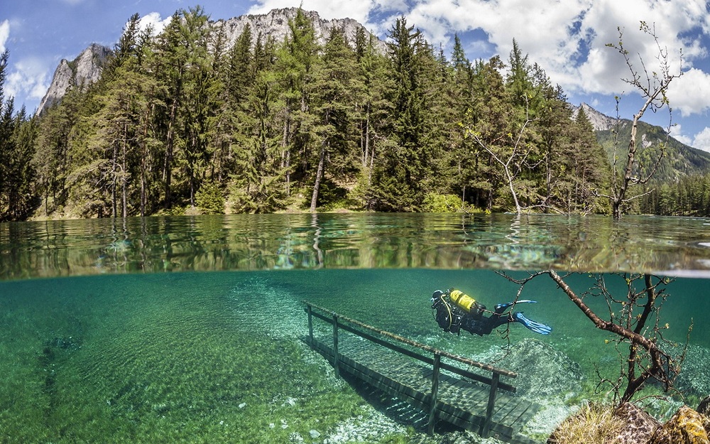 2. Грюнер-Зе (в переводе «Зеленое озеро») в Австрии с чистой и прозрачной изумрудной водой постоянно меняет глубину и размеры. Зимой оно усыхает до большой лужи, покрывающей дно лишь на 1–2 метра.