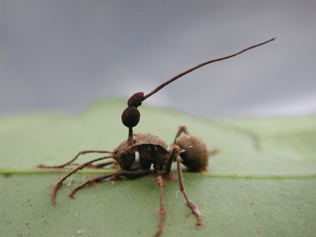 2. Гриб кордицепс однобокий может превращать муравьев в зомби. Споры, попадающие на волосистую поверхность насекомого, прорастают и внедряются в тело насекомого, после чего гриб направляет муравья к месту, где ему будет комфортнее всего развиваться. После прибытия на место, муравей погибает, а гриб начинает расти.