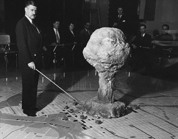 Полковник-лейтенант Артур Кротье показывает возможное воздействие ядерного взрыва на Оттаву, 26 апреля 1952 год