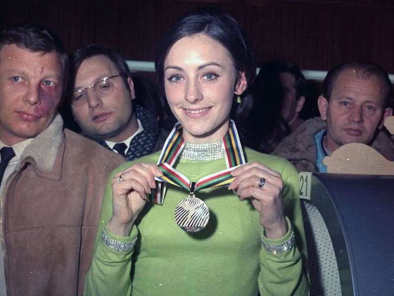 Пегги Флеминг (США), хвастается медалью. Олимпиада. Гренобль. Франция. 1968 год