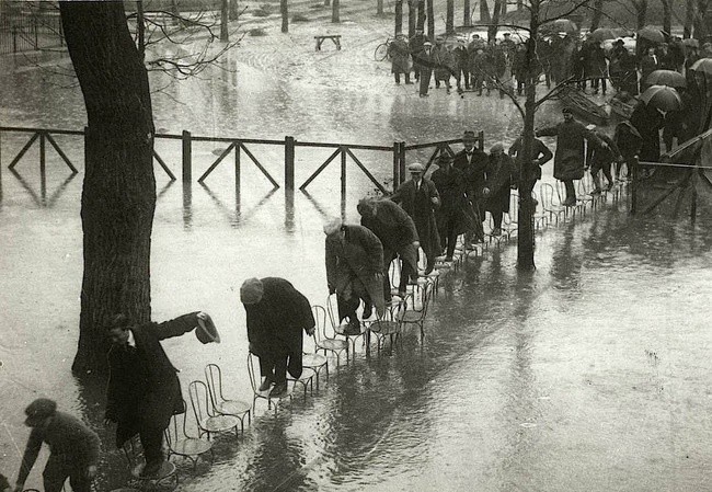 Люди перебираются на другую часть улицы во время наводнения 1924 года в Париже