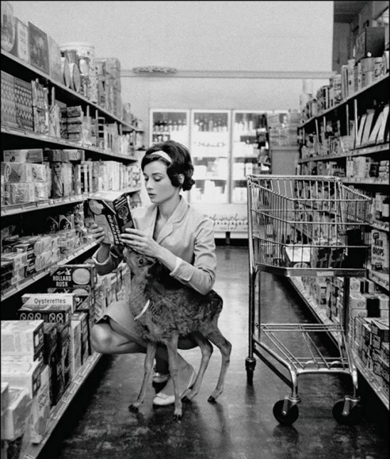 Одри Хепбёрн вместе со своим ручным оленёнком в магазине, 1958 г.