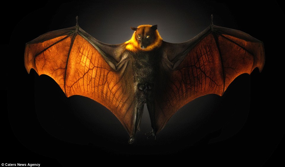 Кажется, что это летучая мышь стоит на снимке. Но это не так. На самом деле она висит вниз головой, а подсветка сзади показывает всю мощь её крыльев