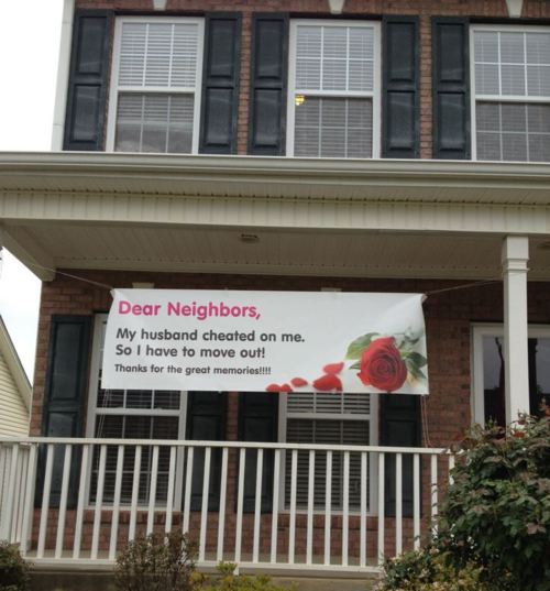 Дорогие соседи, муж мне изменил, поэтому я вынуждена переехать… Спасибо за хорошие дни, проведенные вместе!