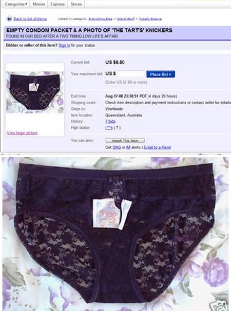 Обиженная супруга выставила на аукцион упаковку от использованного ее супругом презерватива и трусы его любовницы.