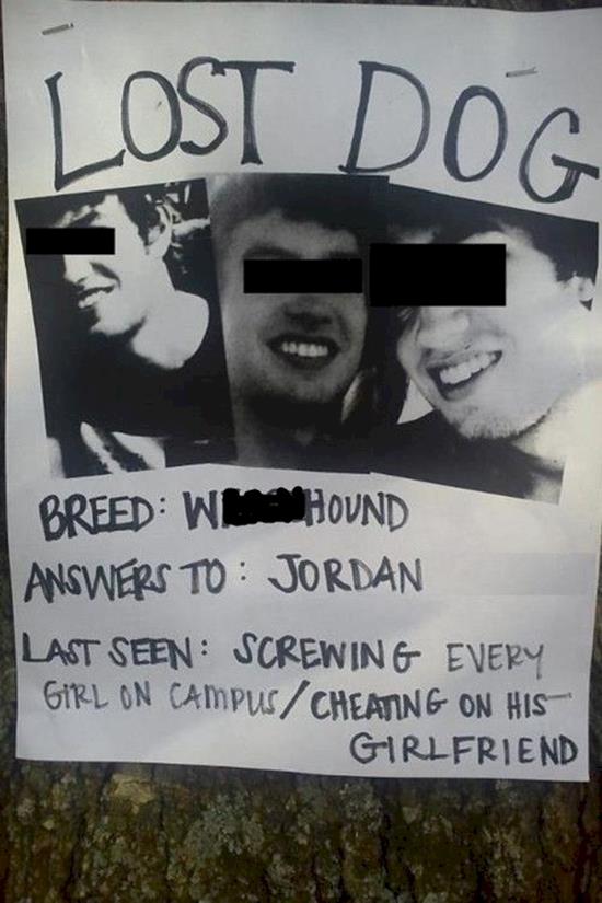 Пропала пёс. Последний раз его видели спящим со всеми девушками с факультета, изменяя своей девушке!